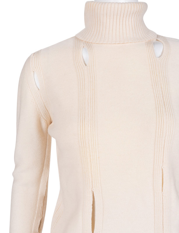 Ivory wool knit turtleneck sweater with ribbed knit collar, sleeve cuffs, and hem, and keyhole details.