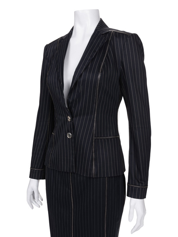 Black and ecru cotton blend pinstripe three piece ensemble trimmed in black leather including a fitted notch lapel jacket with fitted sleeves and front button closure; paired with matching pencil skirt with center back zipper closure and matching boot cut flared pants with front and back patch pockets and front fly closure.