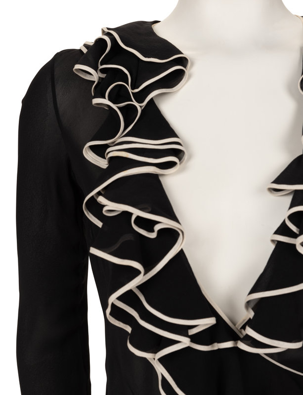 Black silk chiffon wrap front blouse with flounced neckline, flared long sleeves, and left waist tie closure.