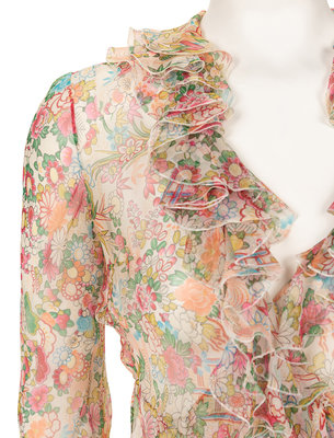 Multihued floral print silk chiffon wrap front blouse with flounced neckline, flared long sleeves, and left waist tie closure.