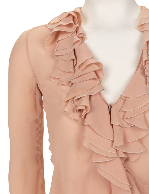 Blush silk crepe wrap front blouse with flounced neckline, flared long sleeves, and left waist tie closure.