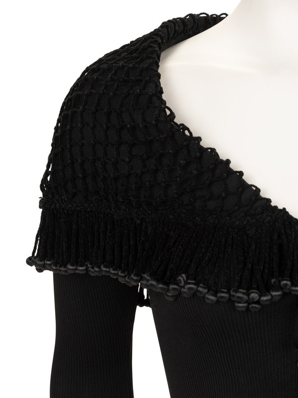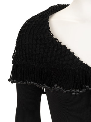 Black silk rib knit cardigan with beaded fringe netting around the shoulders and back, and front button closure.