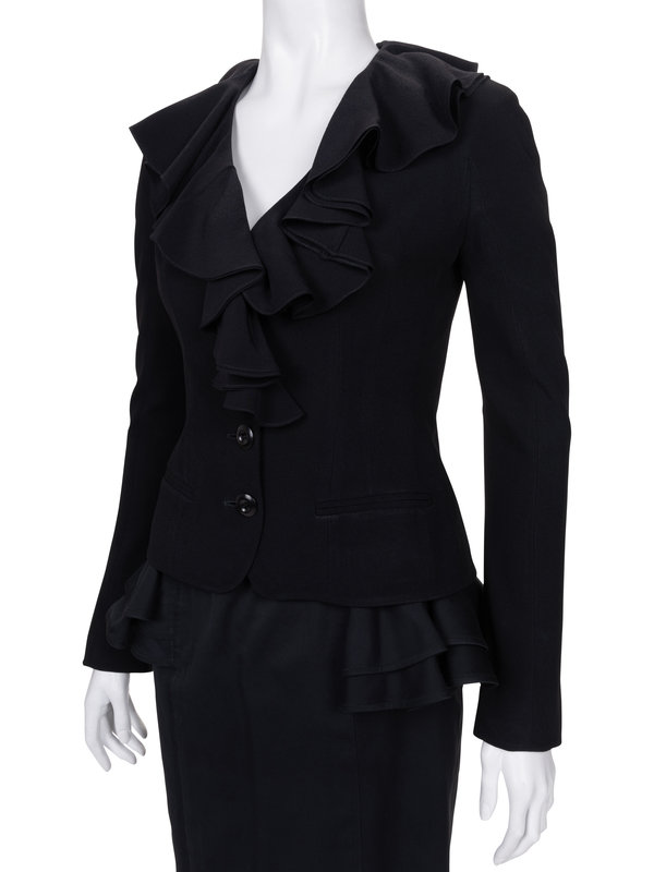 Black viscose/acetate blend fitted jacket with flounced neckline, fitted long sleeves, front hip welt pockets, and center front button closure; paired with black ribbed cotton straight fit skirt with hip flounces and side back zipper closure.