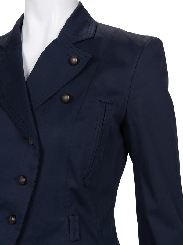 Blue cotton two-piece skirt ensemble including a fitted double breasted jacket with notched lapel, fitted slim long sleeves, front chest welt and hip flap pockets, and front button closure; paired with matching straight fit skirt with center back zipper closure.