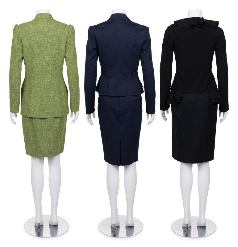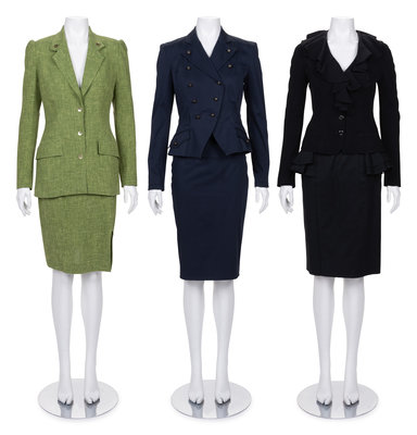 This lot includes three two-piece skirt suits.