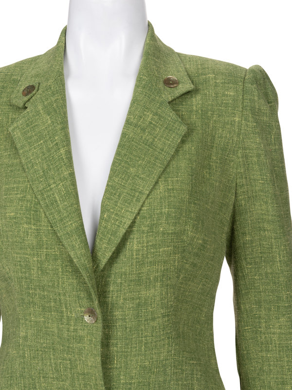 Green viscose/linen blend two-piece skirt ensemble including a fitted single notch lapel jacket with tab and button detail on the collar, long sleeves with elbow patches, front hip flap pockets, and center front button closure; paired with matching straight fit skirt with front left slit and left side zipper closure.