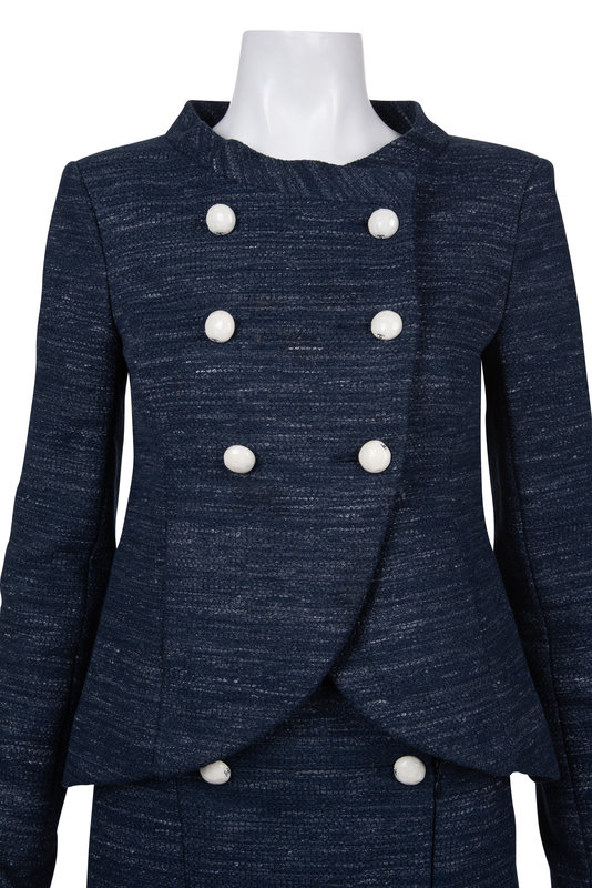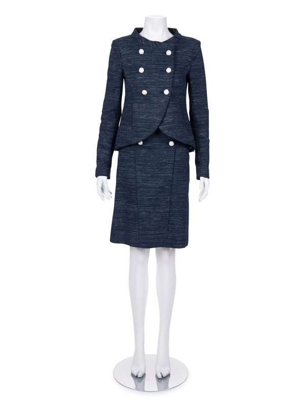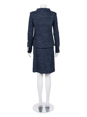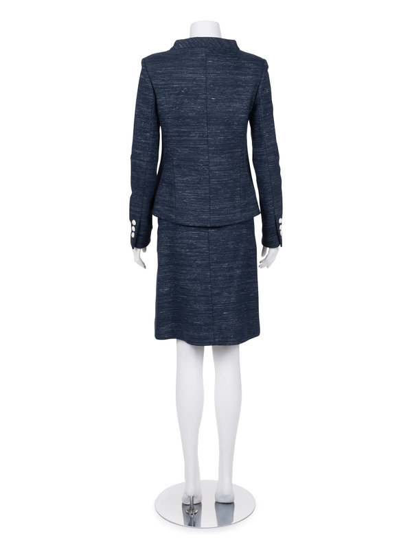 Blue and white cotton blend tweed two-piece skirt suit including a double breasted jacket with a wide set stand collar, fitted sleeves, curved hemline, and front button closure; paired with matching flared skirt with front left zipper closure.