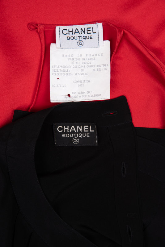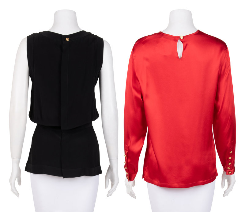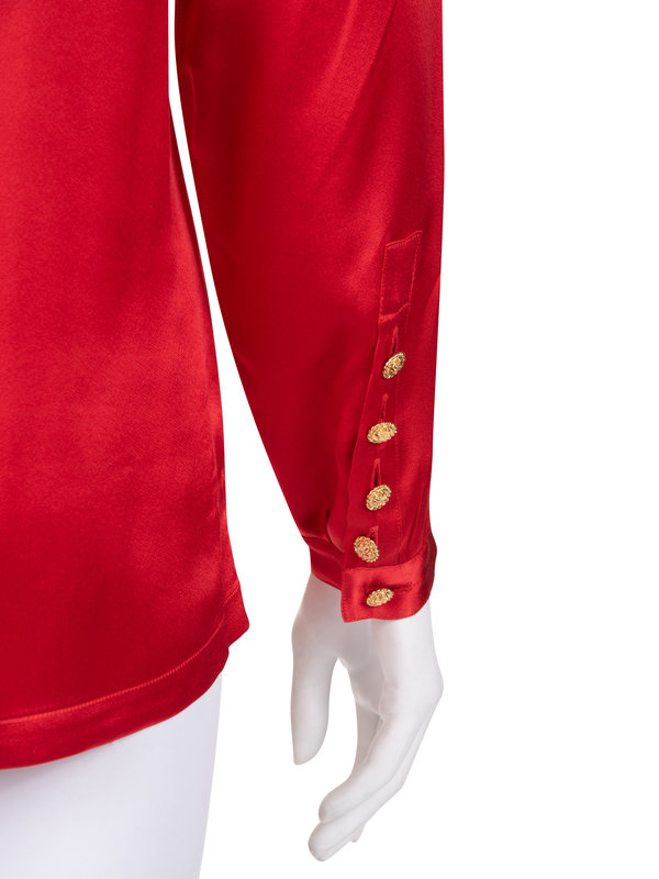 Red silk satin blouse with jewel neckline, barrel cuffed long sleeves, and center back neckline key hole with button closure.