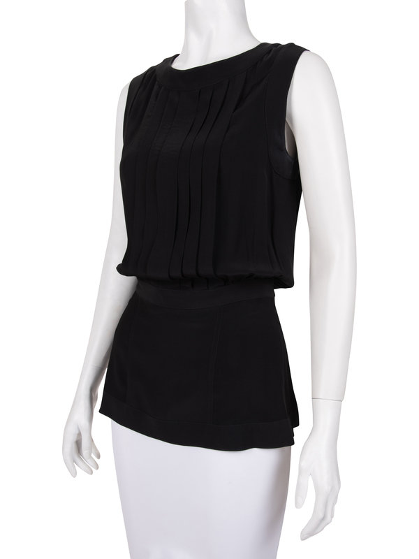 Black pleated crepe sleeveless top with jewel neckline, bloused waist, and center back button closure.