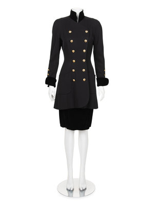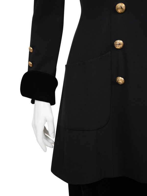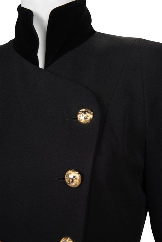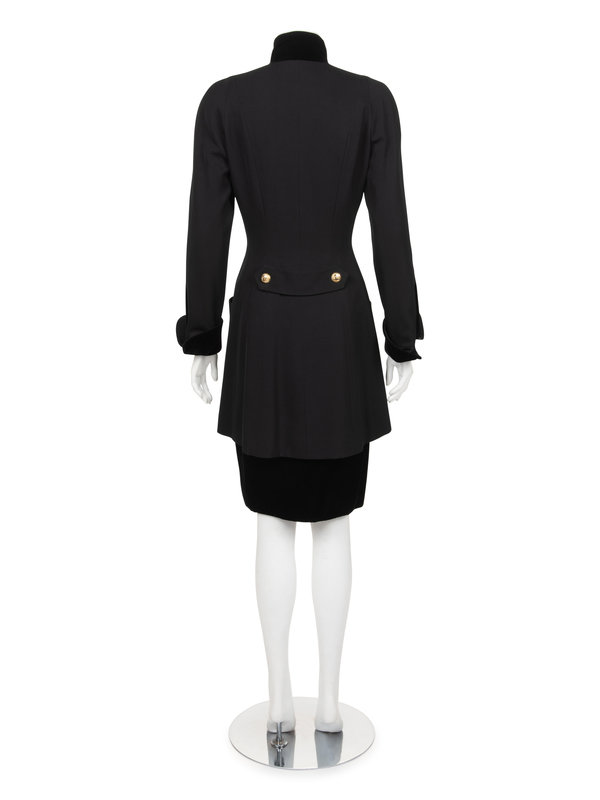 Black wool gabardine double breasted jacket dress trimmed with silk black velvet, stand collar, long sleeves with velvet cuffs and gold-tone button detail, front hip pockets, and center front button closure; paired with black velvet hemmed skirt slip.