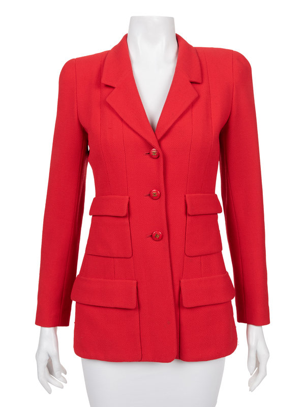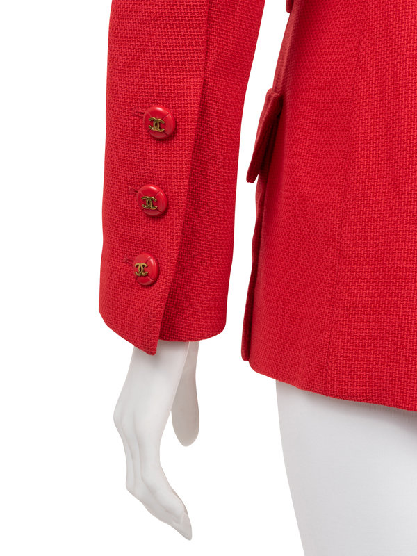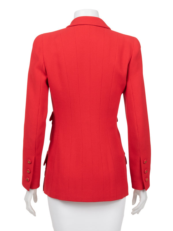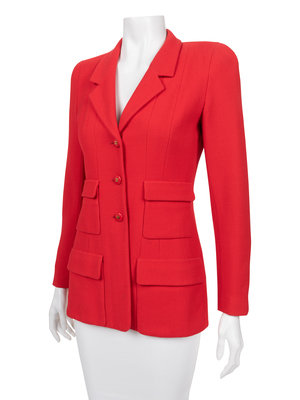 Red wool tweed jacket with notched lapel, padded shoulders into long sleeves, four front flap patch pockets, and front button closure.