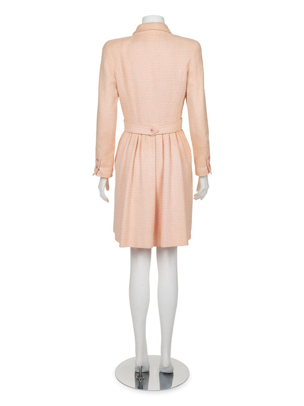 Pale pink cotton/wool blend tweed double breasted jacket with notched lapel, belted waist, shoulder padded into long sleeves, front chest patch pockets, and front button closure.