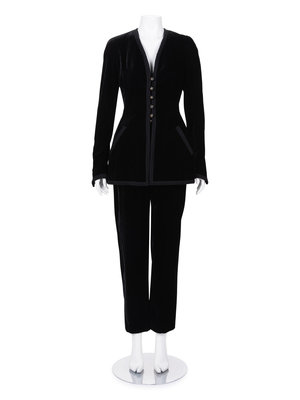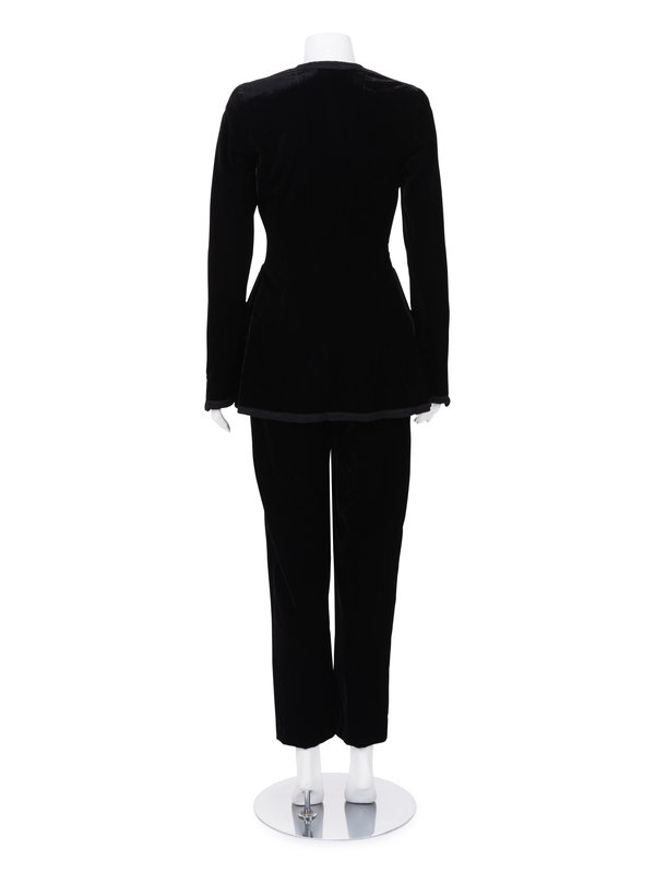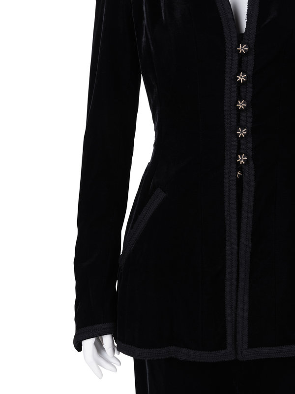 Black cotton/viscose blend velvet two-piece pant ensemble including a long sleeve jacket trimmed with black braid, welted pockets, and front button closure; paired with matching tapered leg pants with front fly closure.