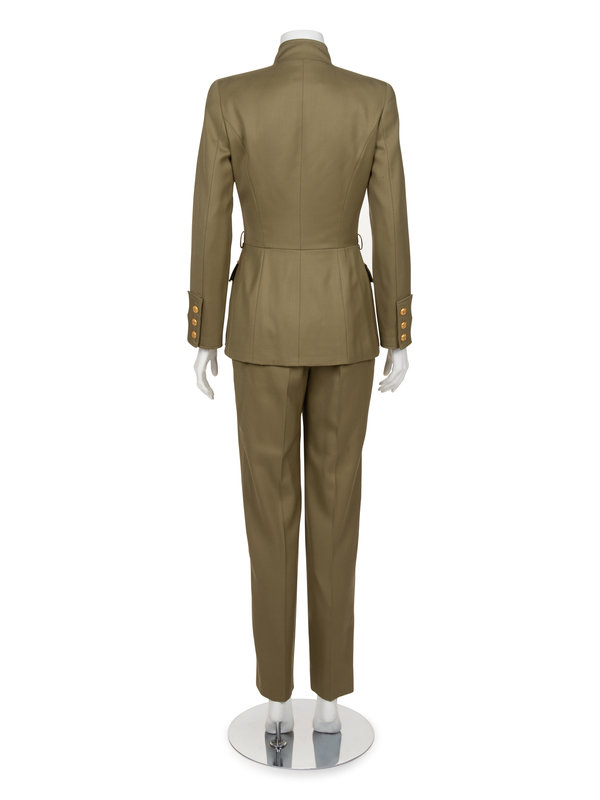 Army green wool twill pant ensemble including a military style jacket with stand collar, four front flap cargo pockets, long sleeves with buttoned flap hems, and front button closure; paired with matching tapered pants with front fly closure.