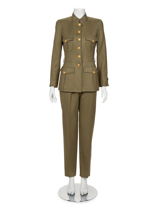 Chanel’s fall/winter 1996-97 ready-to-wear collection was inspired by Karl Lagerfeld’s interest in the military, stating that this collection was ‘an army of beauties’ that were wrapped in tailored fabrics in various shades of gold. This military-inspired pantsuit was worn on the runway with a gold mesh belt embellished with purple stones and a gold leather Chanel flap bag.