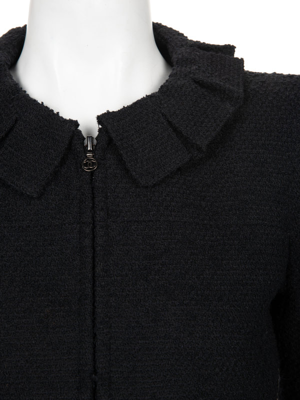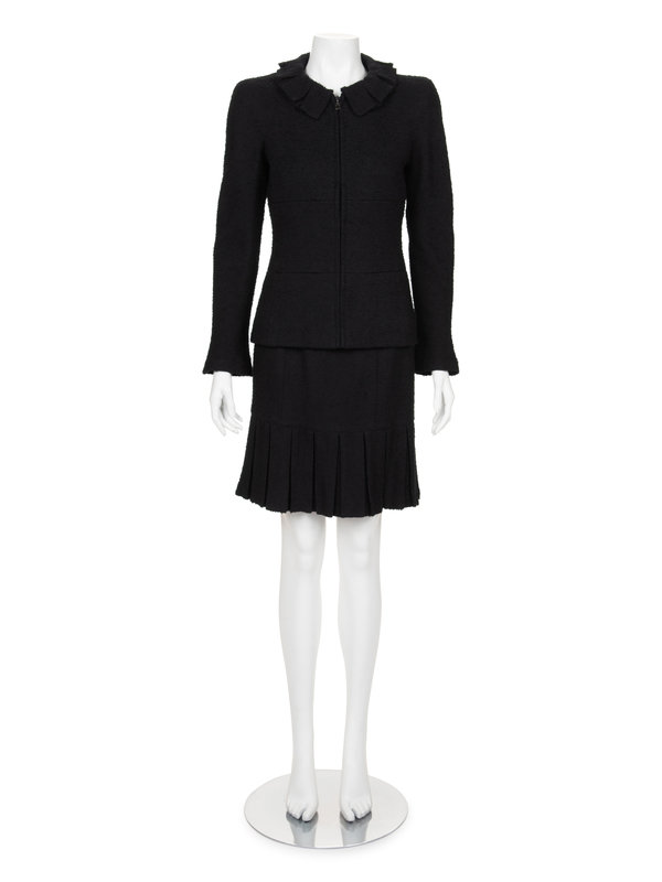 Black wool/nylon blend tweed two-piece skirt ensemble including a paneled long sleeve jacket with pleated collar and center front zipper closure; paired with matching flared skirt with box pleated hemline and center back zipper closure.