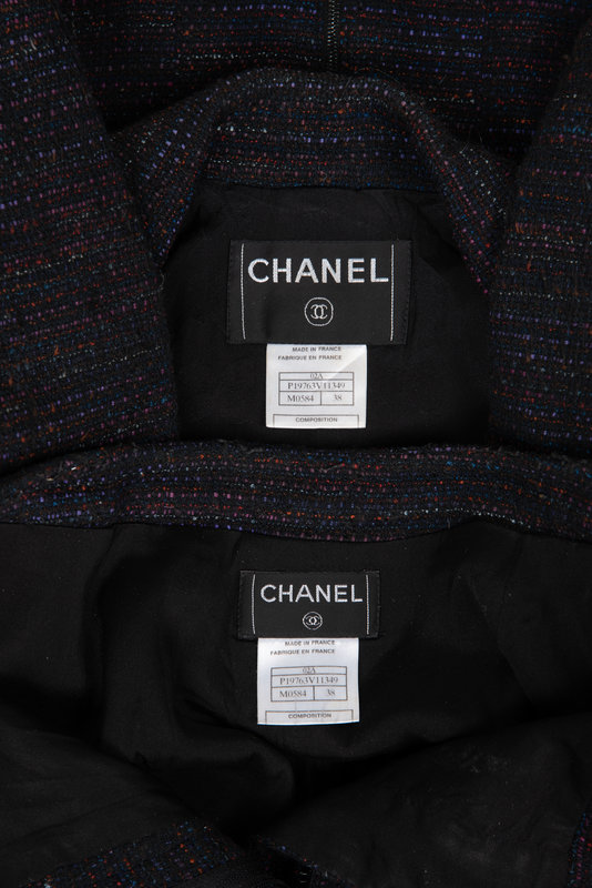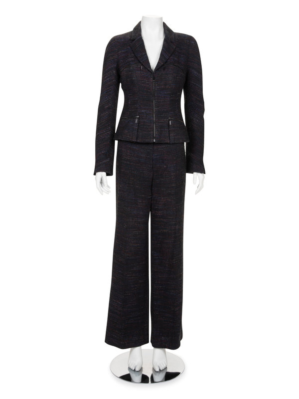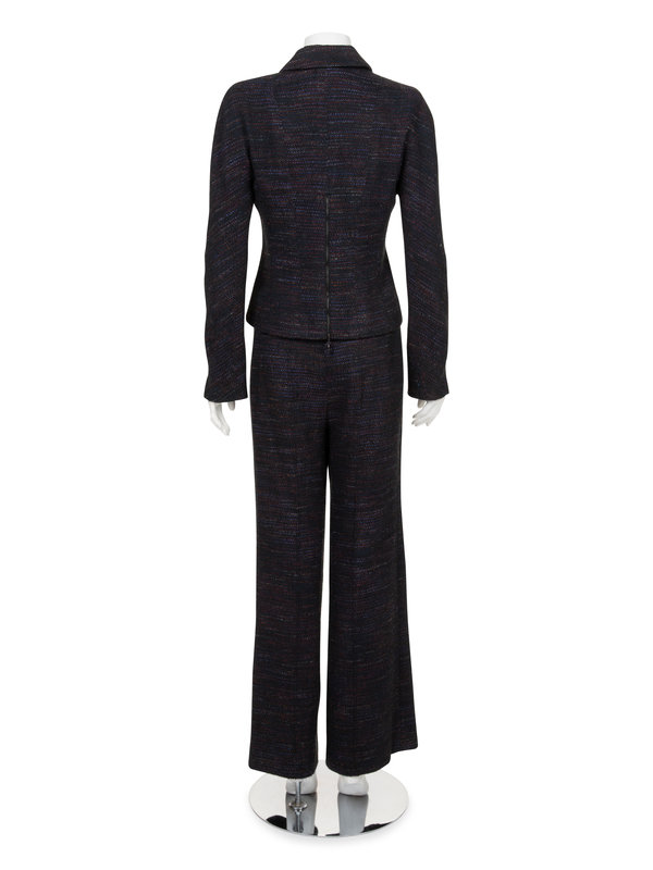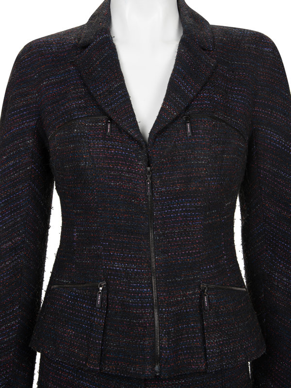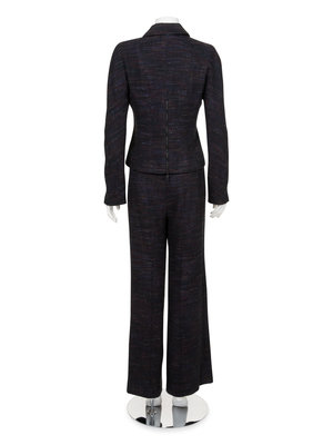 Black, red, purple, and blue acrylic/nylon blend two-piece pant suit including a fitted single notch lapel jacket with long sleeves, four front zip pockets, and center front zipper closure; paired with matching straight leg pants with front fly closure.