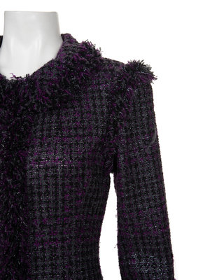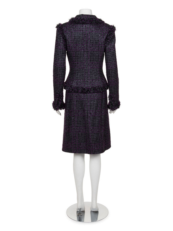 Black, purple, gray and metallic thread wool blend plaid tweed skirt suit including a rolled collar jacket trimmed in loose yarn, long sleeves with pyramid buttons, and front hook and eye closure; paired with matching A-line skirt with center back zipper closure.