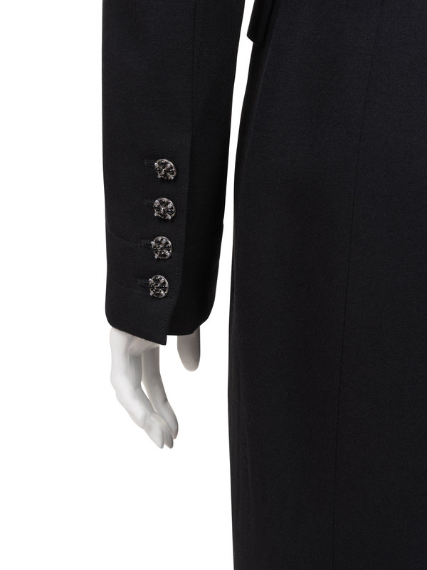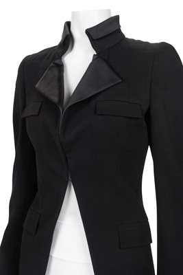 Black wool double breasted tuxedo jacket with large slit in the front , flap pockets, black satin faced banded collar with fold back lapels, back vent and front button closure.