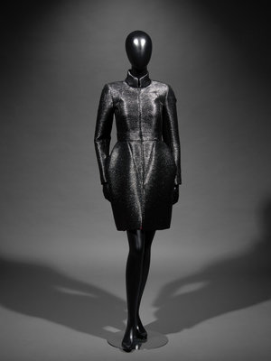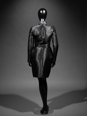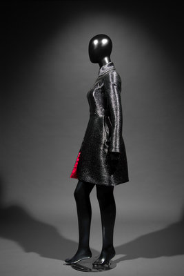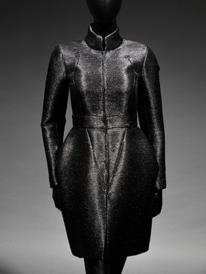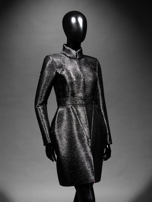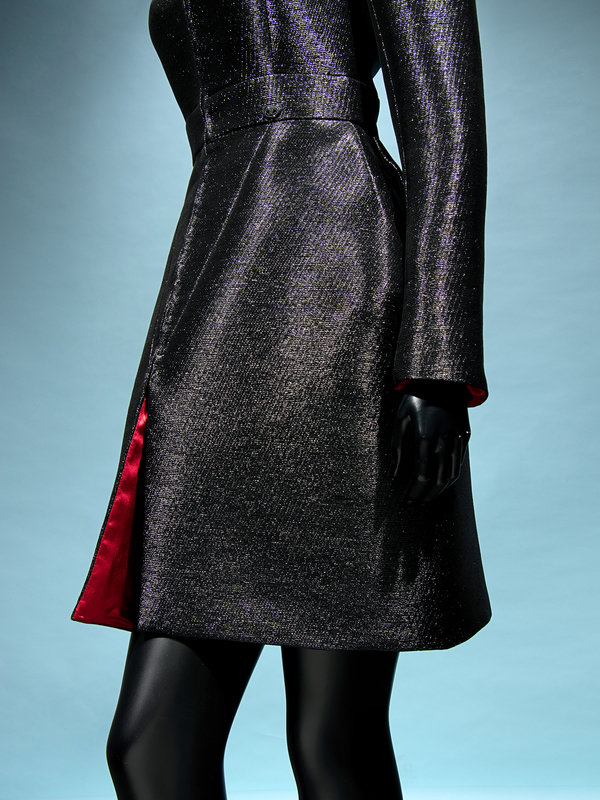 Black nylon/cotton blend lamé jacket dress lined in red silk satin with a Mandarin collar, geometric seaming, and center front zipper closure.