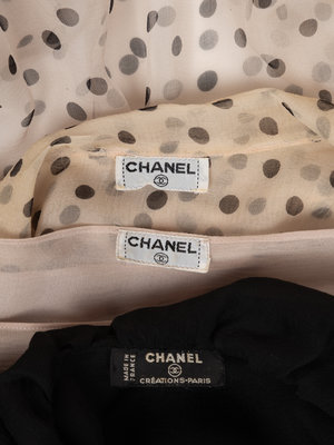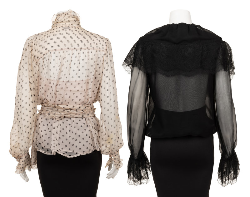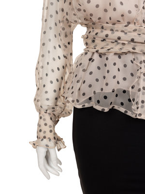 Black and white polka-dot silk chiffon long sleeve tie-neck blouse with front button closure and matching scarf. A second detached sheer nude chiffon top is included.