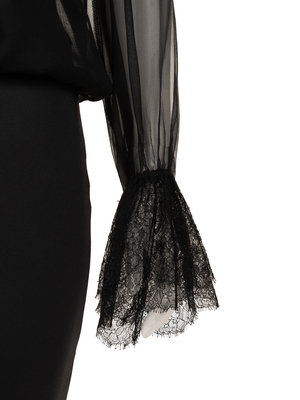 Black lace long sleeve tie front blouse with flounced neckline and lace trimmed full long sleeves.