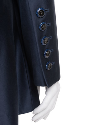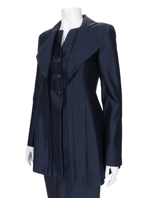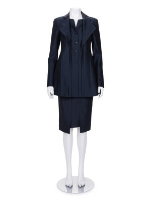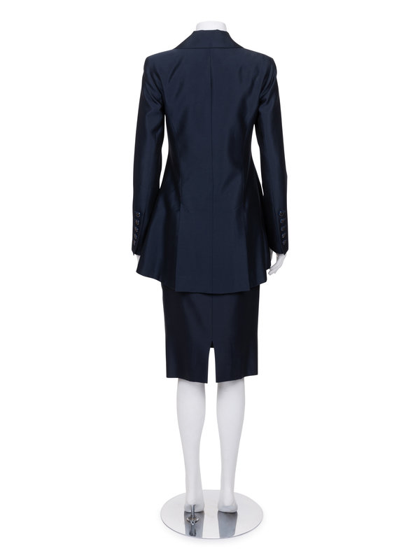 Navy polished cotton/silk sateen two-piece skirt ensemble including a wide notch lapel jacket with fitted long sleeves, inseam waist pockets, and front inset paneled button closure; paired with matching pencil skirt with vertical seaming detail and center back zipper closure.
