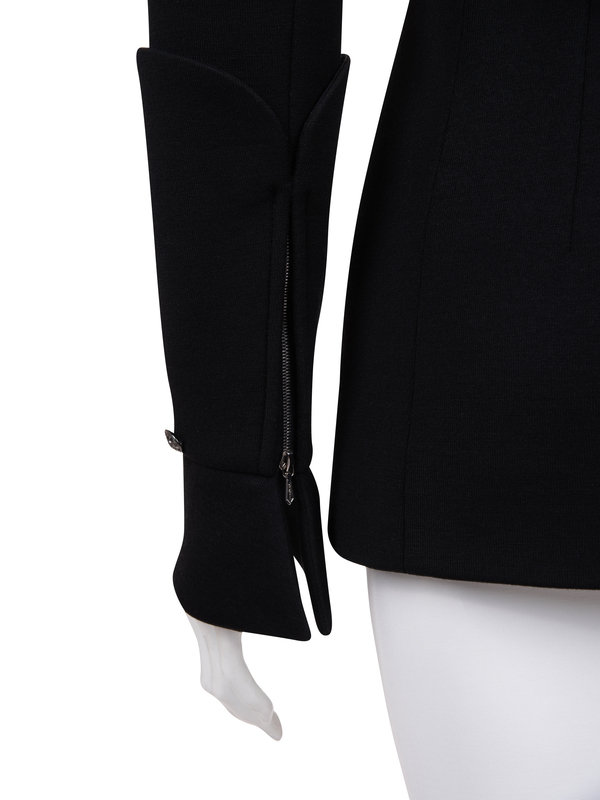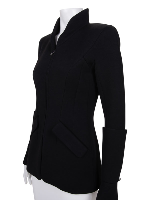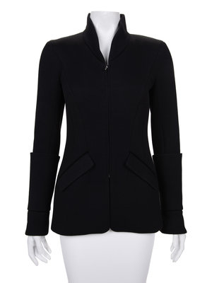 Black wool/nylon blend jacket with high collar, long sleeves with deep rolled up cuffs, front hip welted pockets, and front and back zipper closure.
