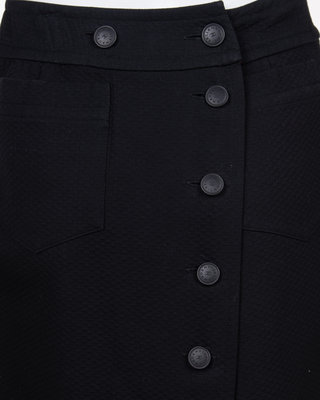 Black cotton wrap-style skirt with front and back slits and back button closure.