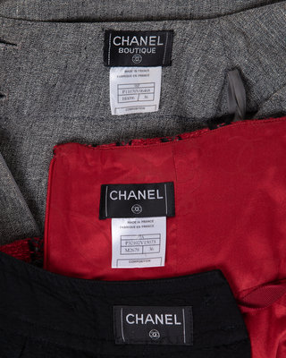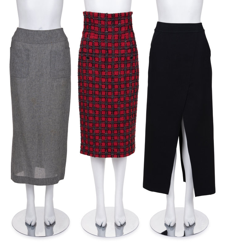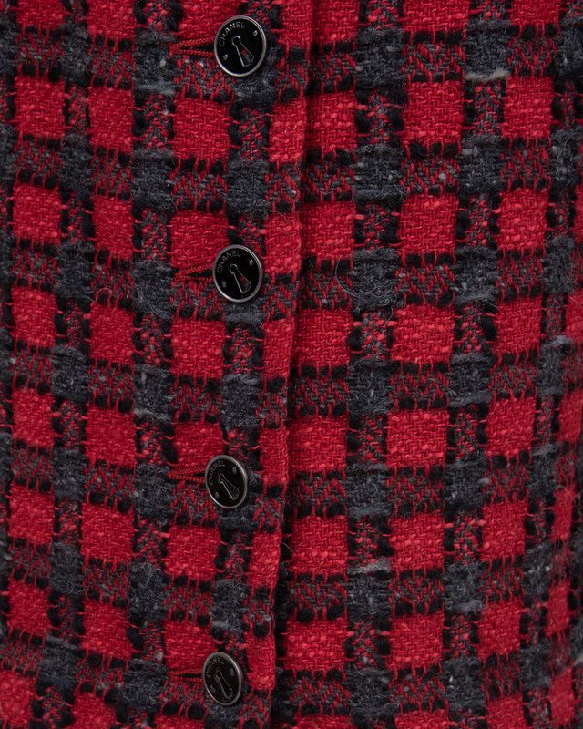 Red, black, and grey high-waisted wool pencil skirt with front pockets and back zipper closure. Fall 2007.