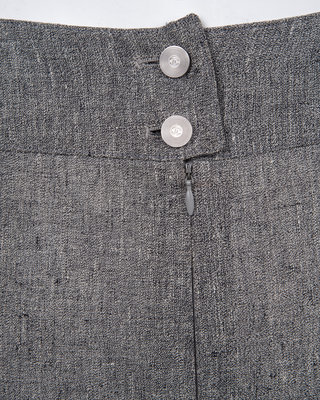 Grey linen midi skirt with two front pockets and zipper closure. Spring 1995.