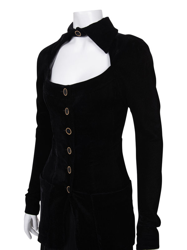 Black cotton/viscose blend velvet jacket with pointed collar, open front neckline, hip patch pockets, and center front button closure.