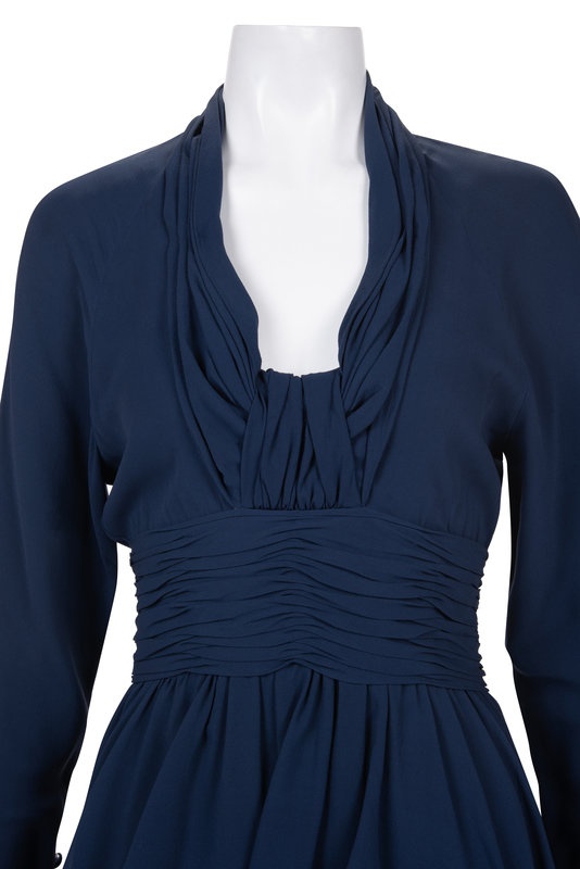Blue crepe dress with gathered neckline, raglan sleeves with buttoned hem, gathered waist into cascade peplum over wrapped pencil skirt, and center back zipper closure.