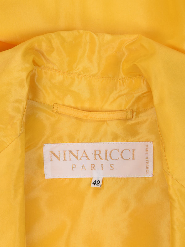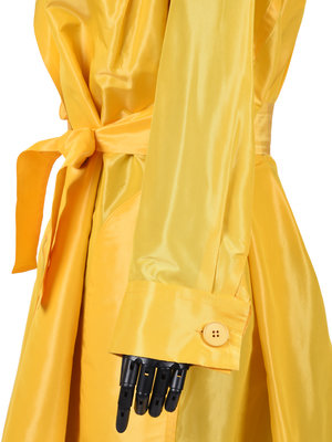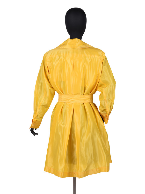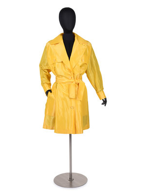 Bright yellow taffeta trench coat with exaggerated collar, front flap chest pocket, long sleeves with French style cuffs, side welted pockets, and front button closure with matching tie belt.