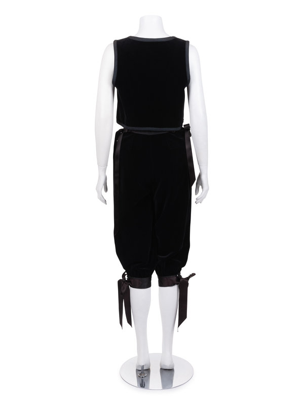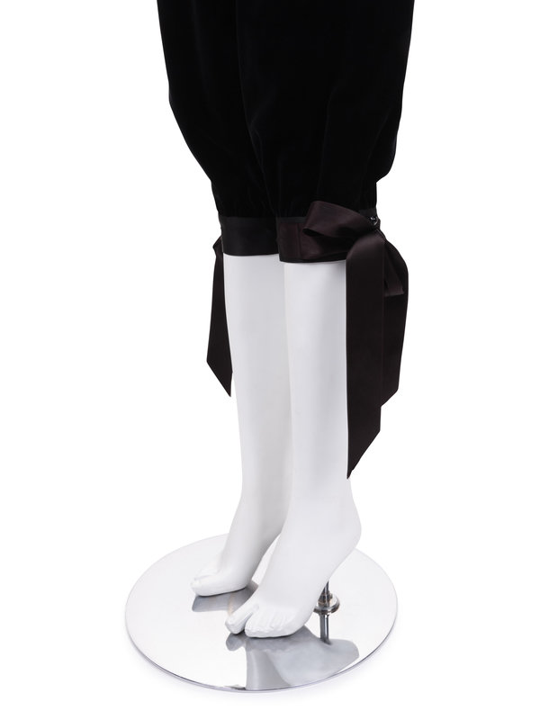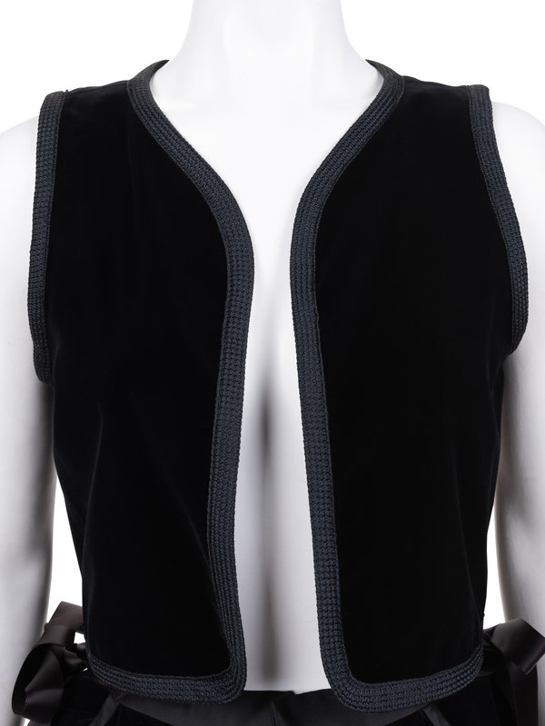 Black cotton/rayon blend velvet two-piece pant ensemble including a cropped open front vest with black braided trim; paired with matching velvet breeches trimmed with black satin and tieable ribbons at waist and knees, and front fly closure.