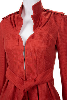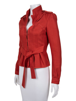 Red cotton/silk blend belted jacket with high collar, single welt pockets, peplum, and front hook and eye clasps with tie belt.