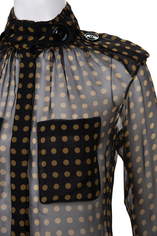 Black and gold silk polka-dot chiffon long sleeve blouse with button detailing around neckline.