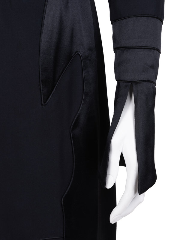 Black silk crepe and satin evening dress trimmed with black silk velvet with mandarin collar and open neckline into gathered bust, flounced shoulders into banded long sleeves, straight fit skirt, and center back zipper closure.