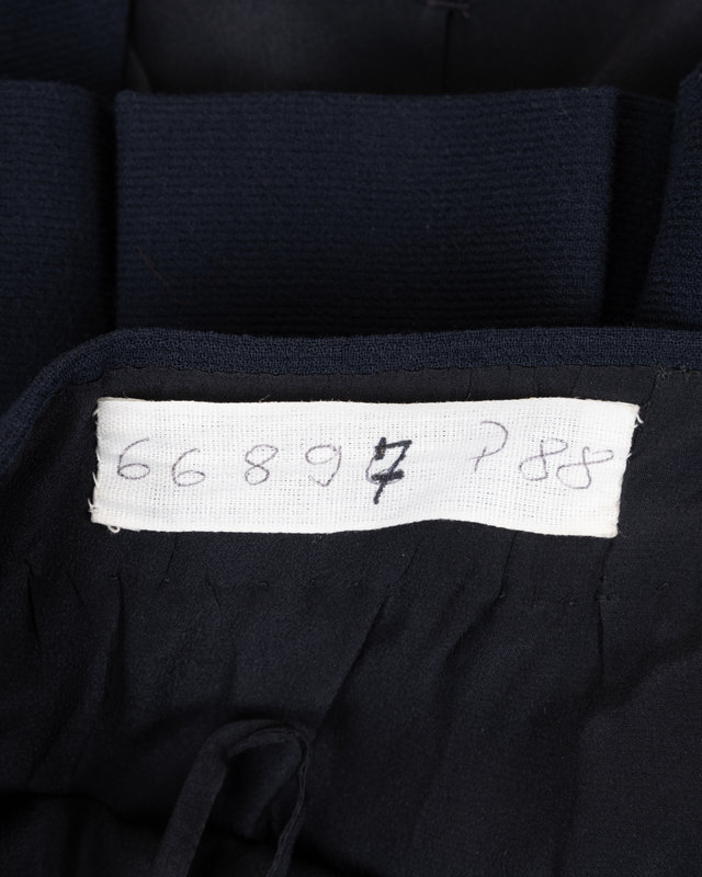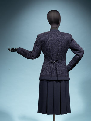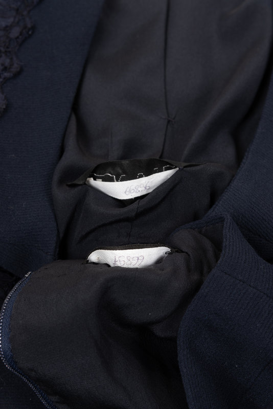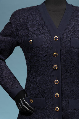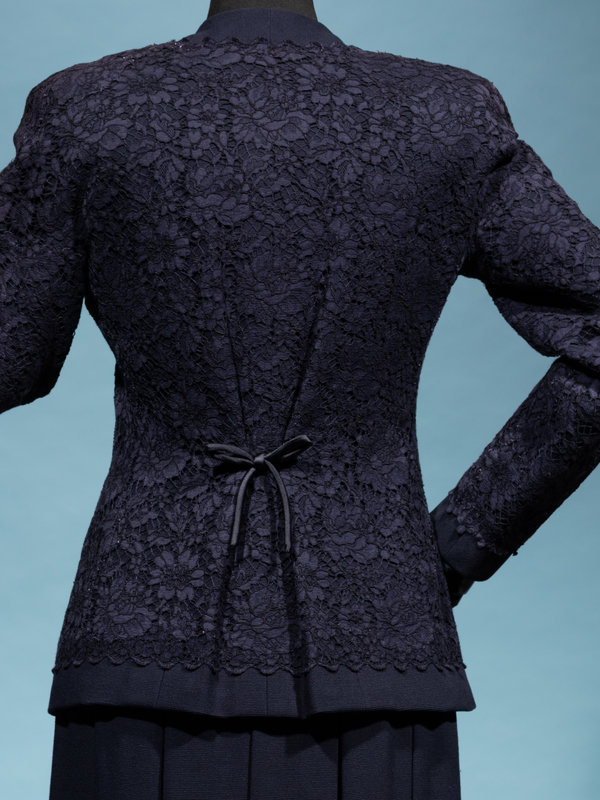 Haute Couture navy lace on navy silk ribbed crepe two-piece skirt ensemble including a cardigan style jacket with front four pockets, back pleated waist with bow, and center front button closure; paired with matching yoked and box pleated skirt with center back zipper closure.