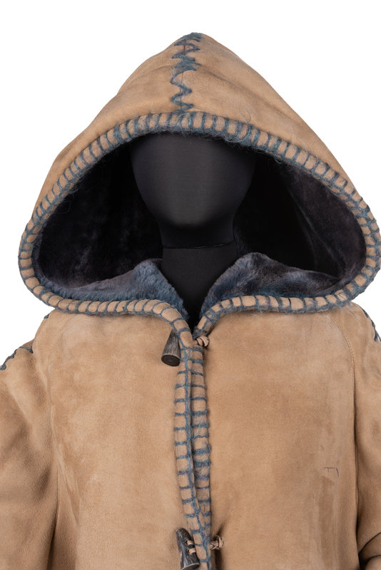Tan suede hooded parka coat with variegated blue Merino wool lining and stitching, welted hip pockets, and horn toggle button front closure.