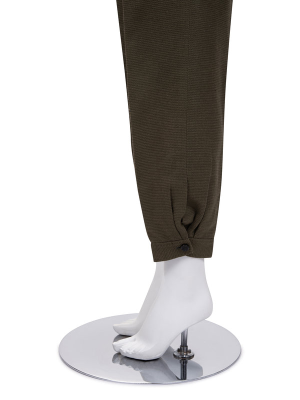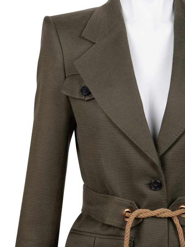 Olive cotton/silk blend two-piece pant suit including a wide notched lapel, set in two-piece sleeves, four front flap pockets, and center front button closure with rope tie belt; paired with matching tapered and cuffed cropped pants with front fly closure.