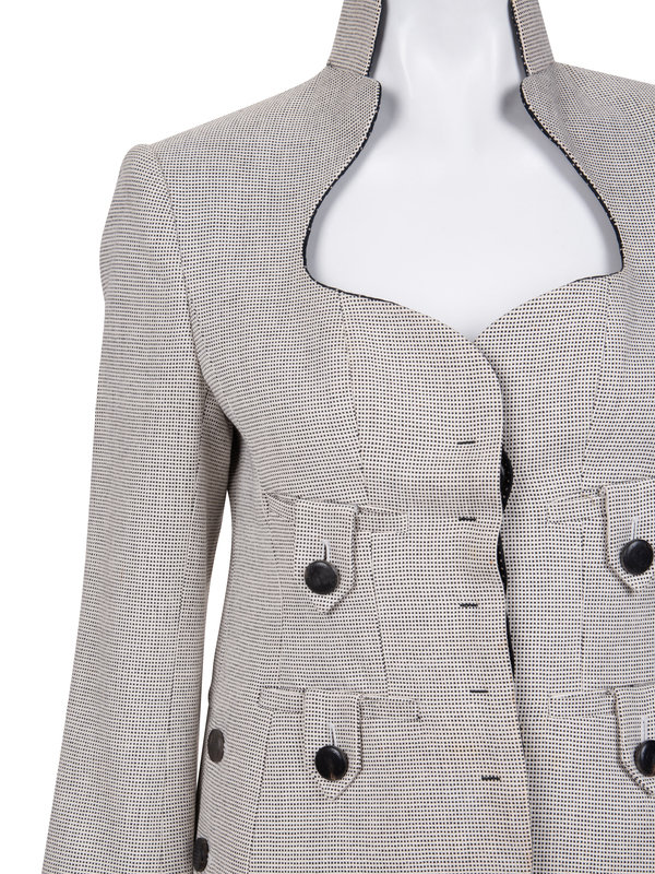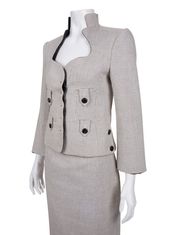 White and black cotton blend two-piece skirt suit including a fitted jacket with stand collar into stylized open neckline, flared two-piece sleeves, front tabbed welted pockets, and front button closure; paired with matching straight fit skirt with left side zipper closure.