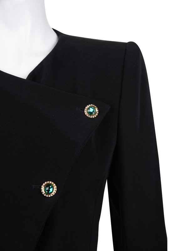 Black wool blend two-piece pant ensemble including a cropped long sleeve jacket with front asymmetrical cut glass closure; paired with matching pleated pants with gathered legs into cuffs, and left side zipper closure.