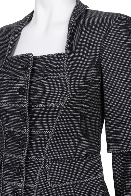 Black and white wool/cashmere blend dotted two-piece skirt ensemble including a built up box neck jacket with draped over sleeve and fitted under sleeve, front waist flap pockets, and front button closure; paired with matching straight fit skirt with flounced hem and center back zipper closure.