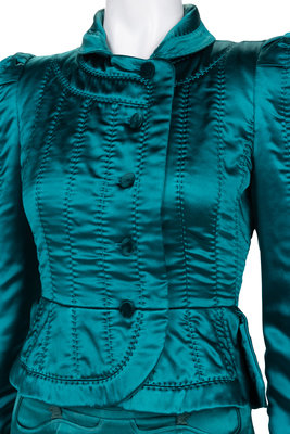 For Fall 2004, Tom Ford recalled Yves Saint Laurent’s iconic Chinese collection, originally debuted in 1977. This teal satin suit features a jacket with a pagoda shoulder more rounded and modern than the original (look 4 on the runway), paired with a streamlined pencil skirt for a twenty-first century wearer.