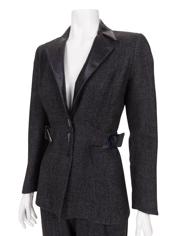 Dark gray linen/nylon blend two-piece pant suit including a fitted jacket with peaked lapel of black metallic polyester/acetate, padded shoulders into fitted long sleeves, belted waist with large metal details, and front snap closure; paired with matching straight fit pants with left side closure.