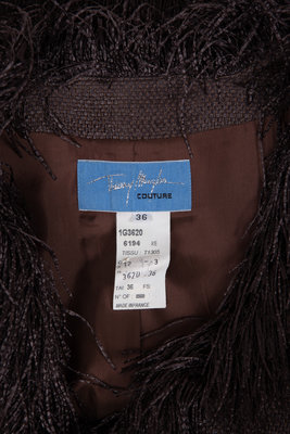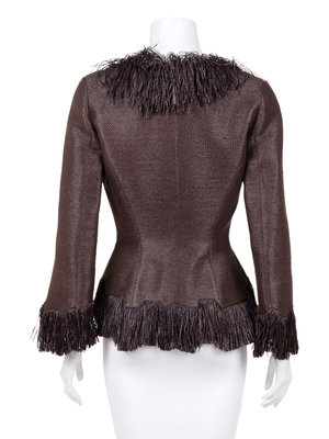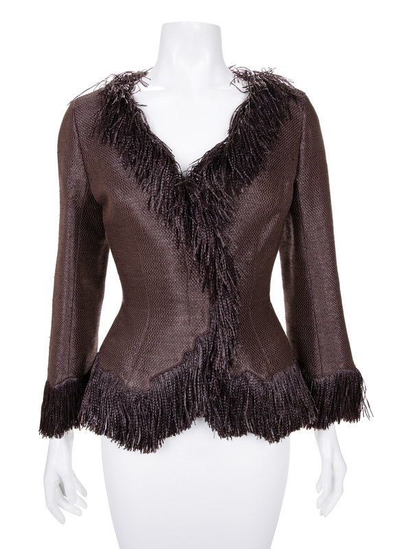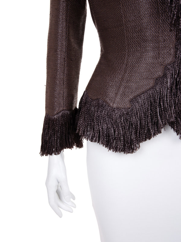 Brown viscose/cotton blend raffia basket weave jacket with fringed detail around the neckline, opening, and sleeve hems, and center front snap closure.