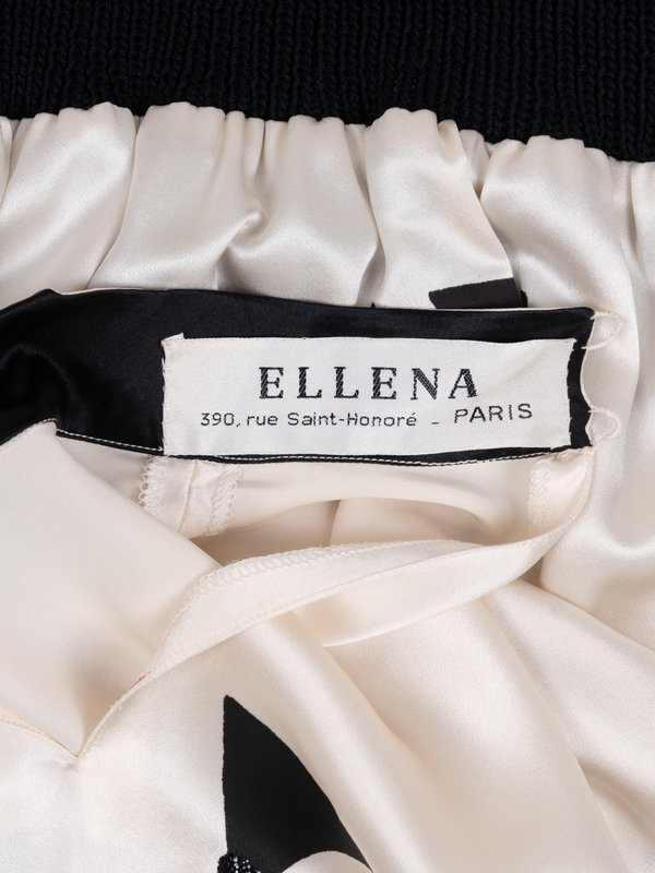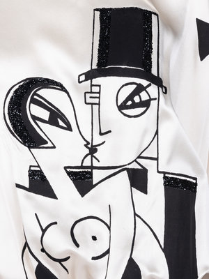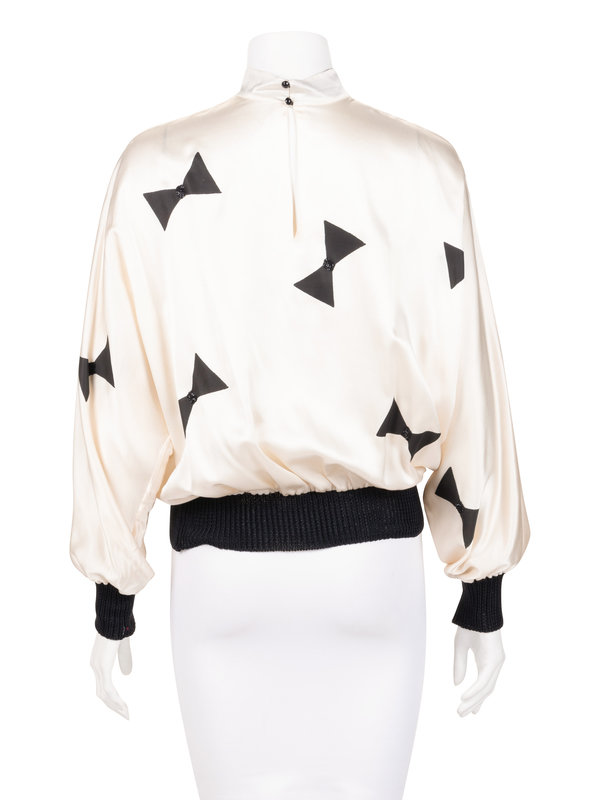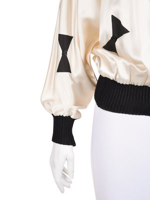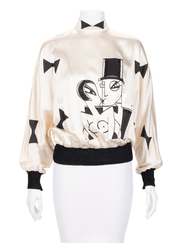 White silk satin and black silk ribbed knit top with black hand painted bow ties and man and woman kissing, wing tip collar, and dolman sleeves with black knit cuffs.