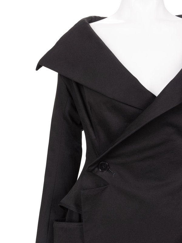 Black cotton broadcloth coat with exaggerated notched shawl collar, slim long sleeves, hip welted pockets, and front button closure.