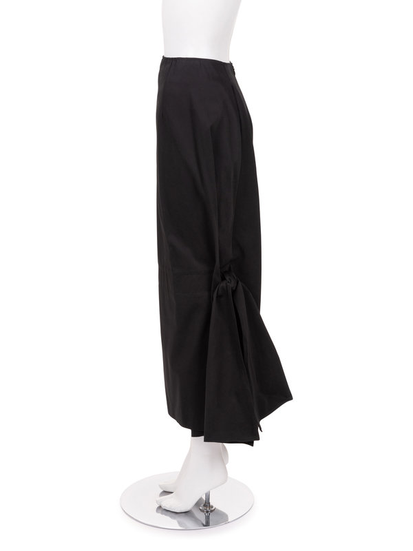 Black cotton broadcloth skirt with flared hemline, back left pleating and attached tieable bow, and center back zipper closure.